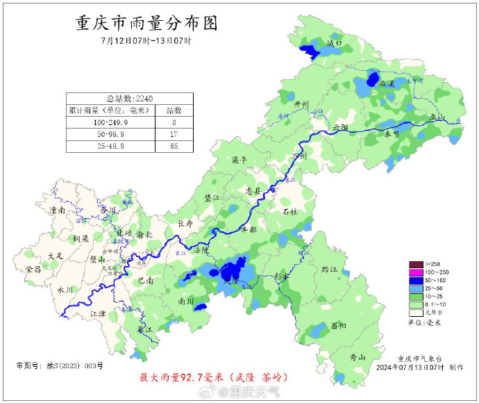 据重庆市气象台统计,12日7 时—13日7时,重庆大部地区出现了阵雨,雨量普遍为小雨,偏南和东北部部分地区遭遇中到大雨,南川、城口、巫溪、武隆4个区县的17个雨量站达暴雨。最大雨量出现在武隆茶岭,为92.7毫米。